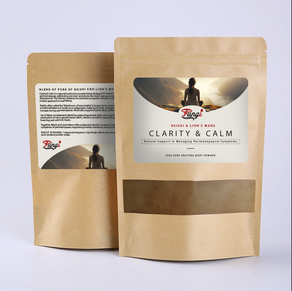 Clarity & Calm is a natural mushroom powder blend designed to support women during perimenopause, addressing common symptoms like mood swings, anxiety, brain fog, and sleep disturbances. This blend combines the powerful properties of Reishi and Lion’s Mane mushrooms for a holistic approach to well-being.